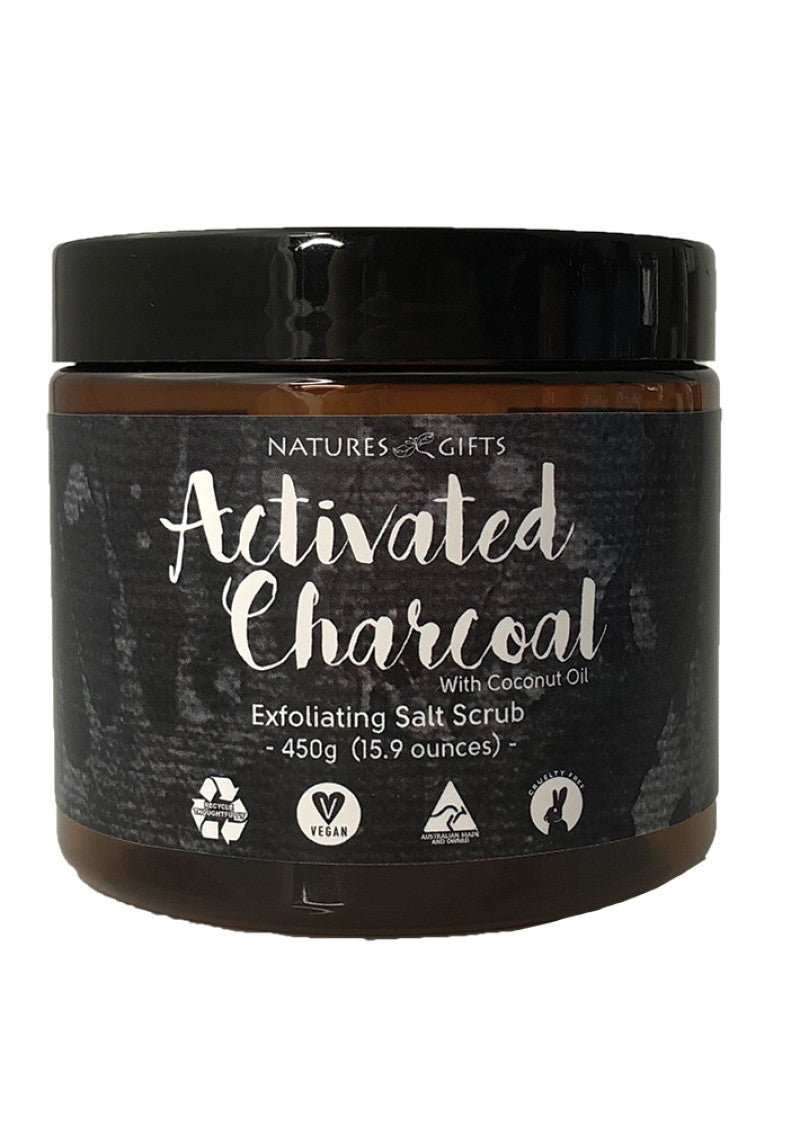 An exfoliating salt scrub with Activated Charcoal and Coconut Oil that may detox, cleanse and naturally moisturise your body. Combine bi-weekly use of this scrub with daily application of Activated Charcoal Moisturising Cleanser for a detoxifying skin care routine.