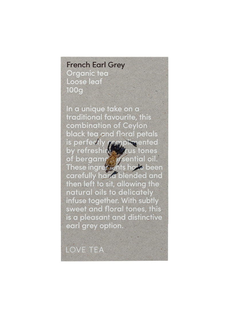 Certified organic Ceylon black tea*, rose, cornflower°, bergamot essential oil.