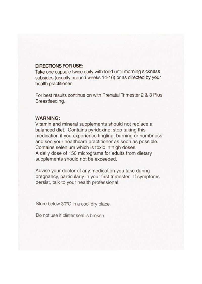 Clinically formulated by an experienced fertility naturopath. A high quality prenatal multi designed specifically for the first trimester and to reduce morning sickness.